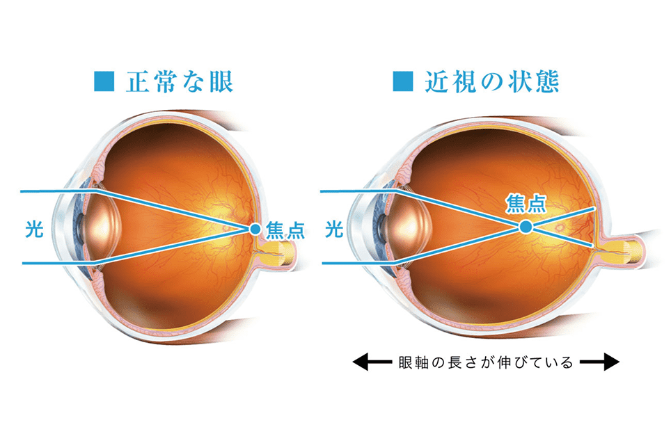 眼球の長さである「眼軸」の長さが正常よりも長いために、ピントが網膜より手前に合ってしまう。